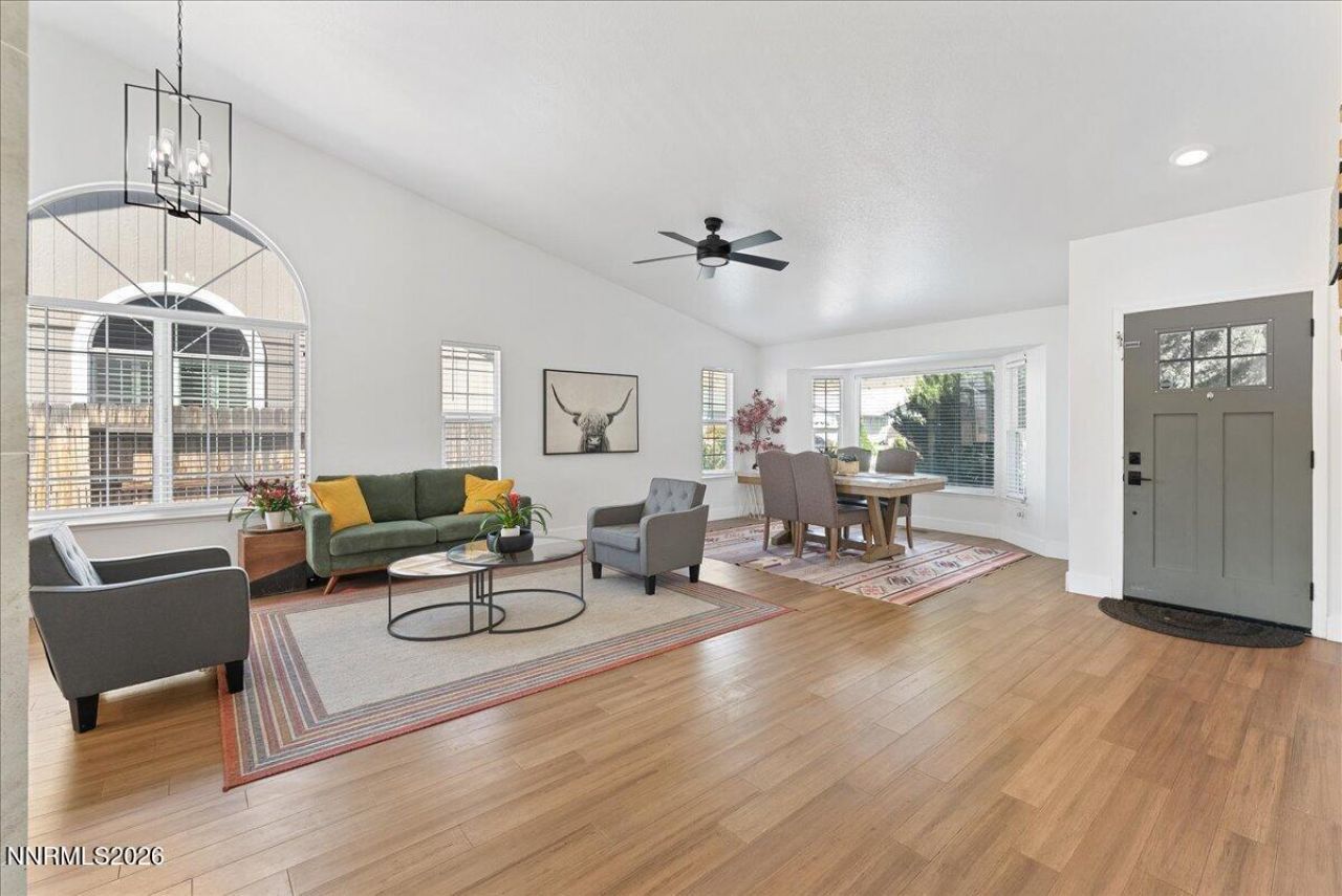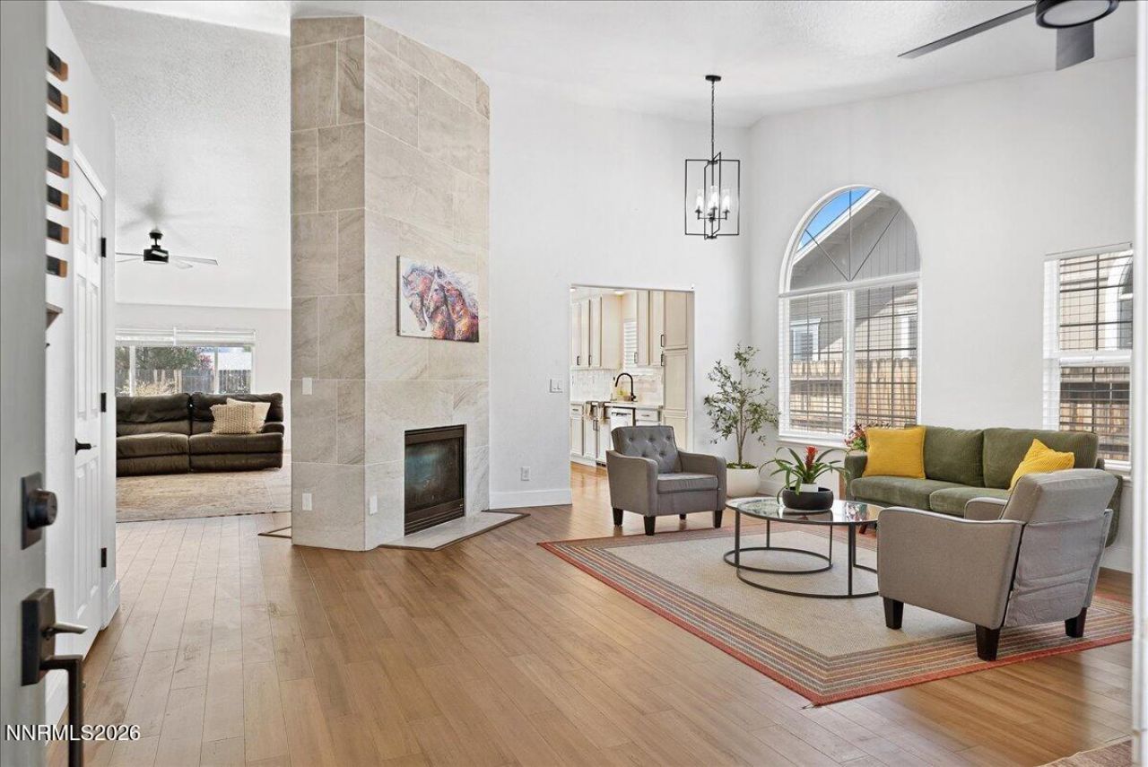 You don't just live here, you enjoy LIFE! Two living areas connected with a stunning double-sided fireplace and 1/3 of a fully landscaped acre give you all the space you and the family need to love being inside or outside! Updated bathrooms, a beautiful kitchen, natural light from all windows and beautiful real wood bamboo floors let you move right in without touching a thing. Primary and 3 bedrooms on one wing, with the 5th bedroom around the hall, perfect for a guest space, work from home office or playroom. Oversized laundry room may actually make you want to do laundry, with a sink right off the garage to wash up. Well-sized 3 car garage and door to the side yard with RV Parking gives you all the room you need for the toys and more. Zoned for coveted Spanish Springs schools, and right next to Pinecrest Charter school, Lazy 5 park and splash pad, hiking, biking, Red Hawk golf course and Golden Eagle sports complex, a 5 minute drive to coffee and groceries, you couldn't pick a better location for peace and quiet yet close to everything you need.